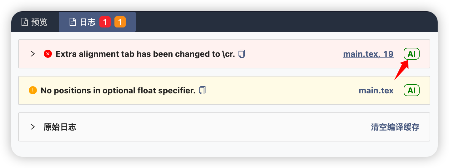 在编译 LaTeX 文档时,会产生编译日志,TeXPage 在展示日志时会自动将日志整理分类,这会帮助用户更加方便的查阅编译日志。 如果 LaTeX 文档编写有误,会产生错误日志,根据错误日志调试 LaTeX 文档不是一件容易的事情。 TeXPage 利用最新的 AI 能力辅助调试 LaTeX 文档,提升 LaTeX 文档调试效率。