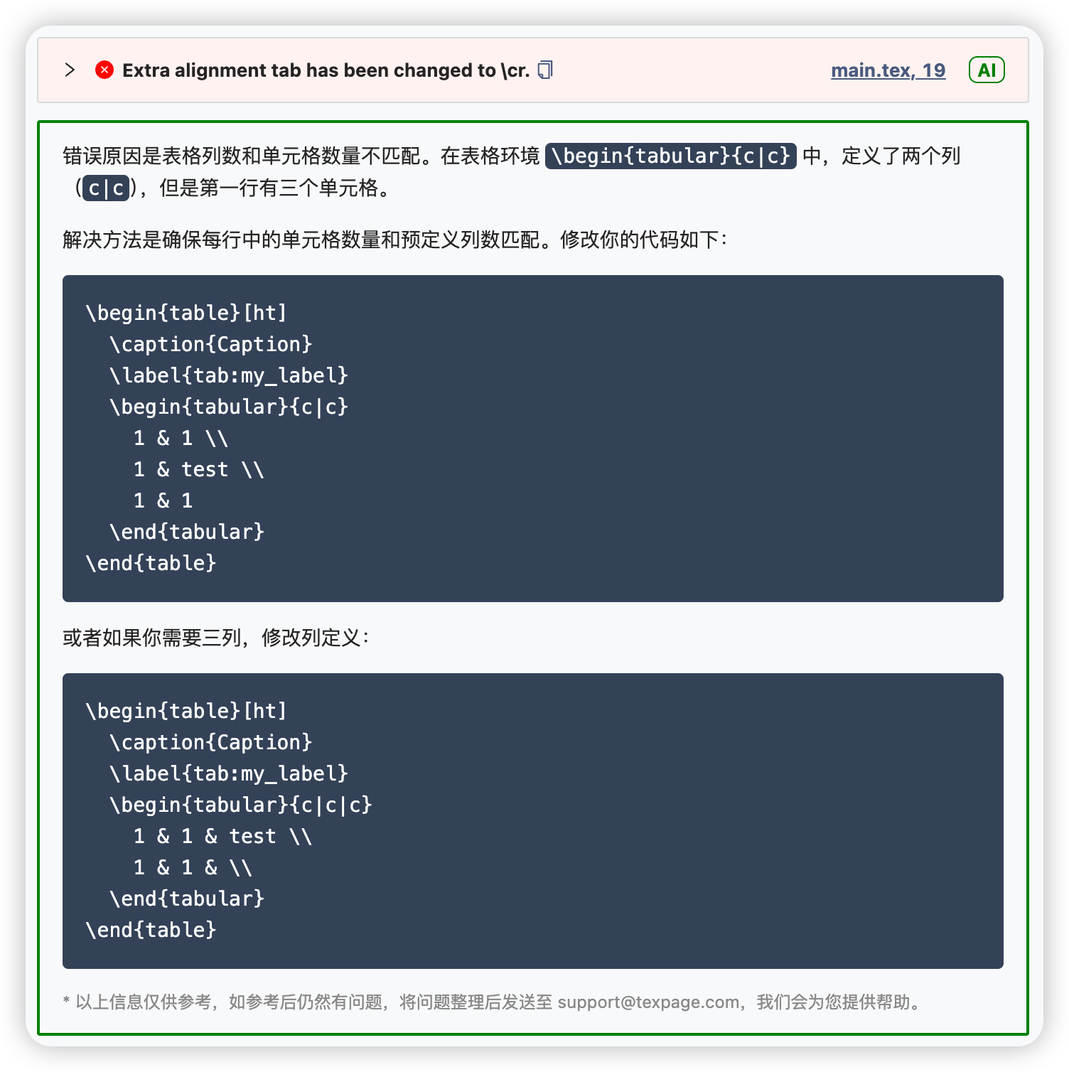 AI 辅助调试信息由大模型生成,仅供参考,如参考后仍然有问题,将问题整理后发送至 support@texpage.com,我们会为您提供帮助。