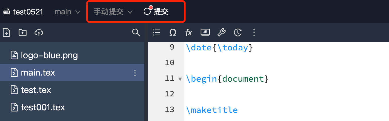 - 手动提交模式下,只有协作者点击提交按钮后,协作者才会看到最新的文档内容。如果还没有调试完 LaTeX 代码,就可以先不提交,等代码调试完成后再提交,这样就不会影响其他协作者编译,这就是异步协同了。