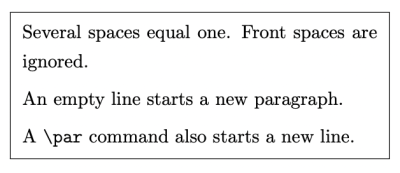 行末的回车视为一个空格;但连续两个回车,也就是空行,会将文字分段。多个空行被视为一个空行。也可以在行末使用 \par 命令分段。