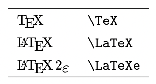 我们见到的所有错落有致的 LaTeX 标志都是以下命令输入的: