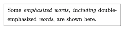 \emph 命令用来将文字变为斜体以示强调。如果在本身已经用 \emph 命令强调的文字内部嵌套使用 \emph 命令,内部则使用直立体文字: